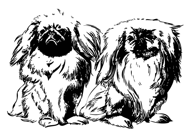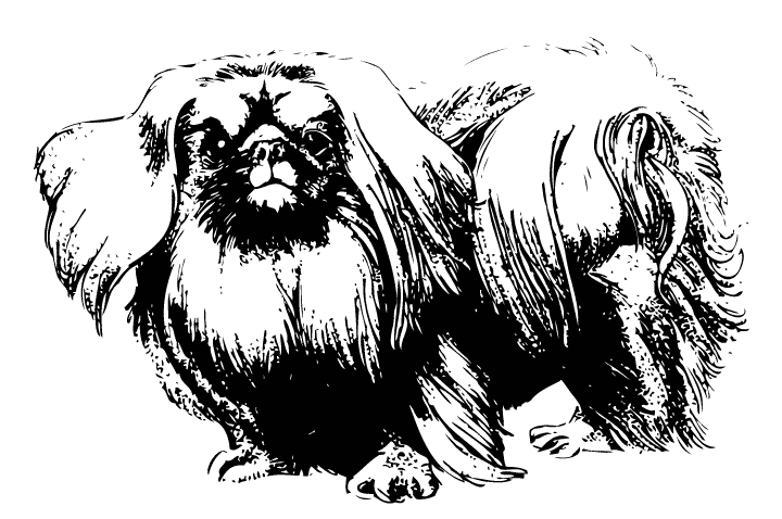 Gracioso perro de pelo precioso, largo con variedad de colores. Cabeza maciza, ojos grandes, orejas en forma de corazón y largas. El pequinés es un perro valiente y gallardo, independiente y de aspecto leonino. El dibujo realizado con líneas recrea el oscuro hocico y su brillante pelaje.