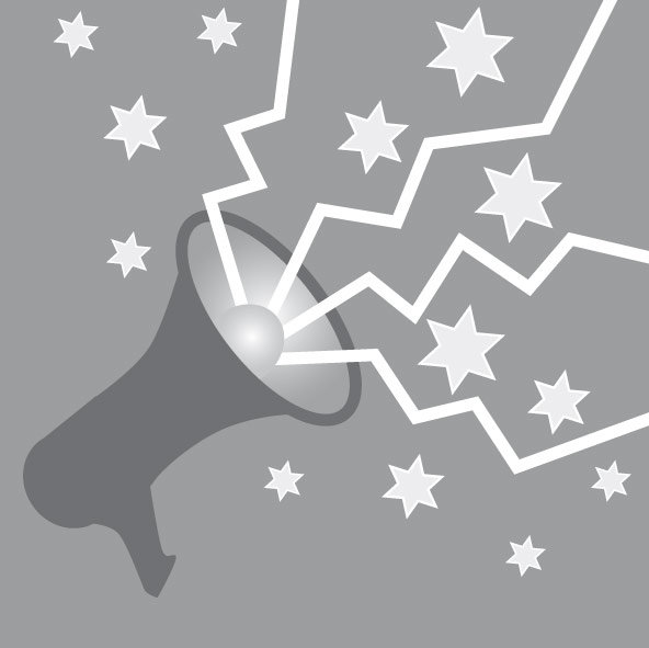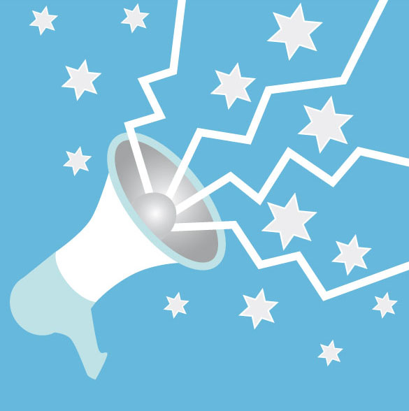 Diseño gráfico con la ilustración de un altavoz con estrellas y líneas que simulan el ruido y alto volumen de sonido