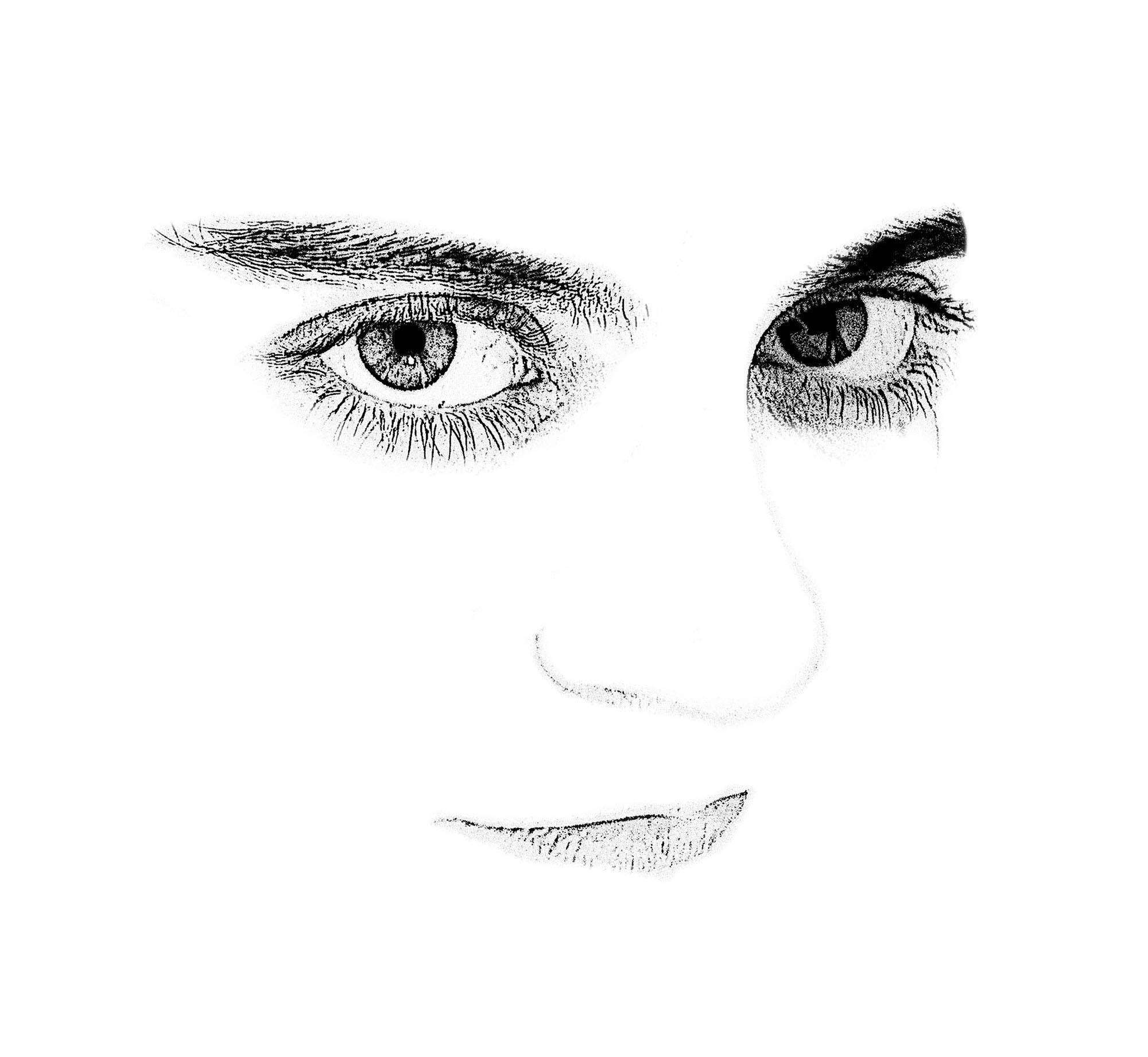 Ilustración en blanco y negro con el dibujo de un rostro de mujer. Los ojos grandes, con pestañas y cejas. Los labios muy finos y suaves. Dibujo digital.