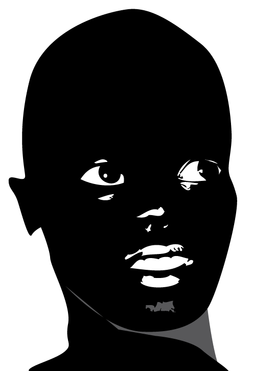 Close up of a black child. In his face we can see his eyes and mouth painted white. Color contrast between the white lights and black leather. Simple illustration with the infant’s face.