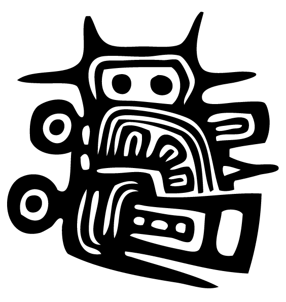Marca o sello de identidad de una persona en la antigua sociedad azteca. El dios del viento es representado como una máscara con un pico. Original dibujo azteca con formas redondeadas, líneas y huecos, configurando un símbolo personal.