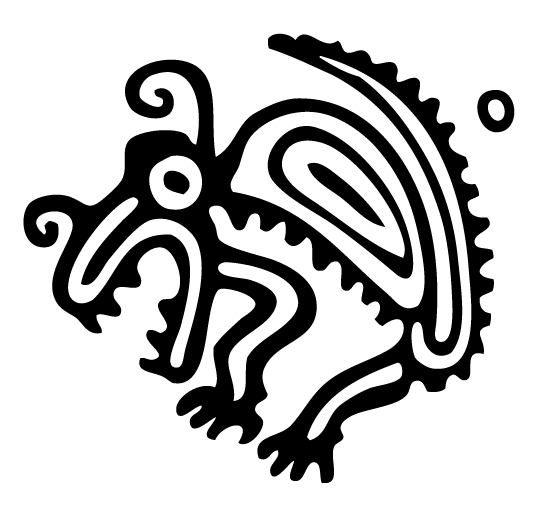 Estampa, marca o sello de identidad de un guerrero de la antigua sociedad azteca. Un dibujo de una figura que se parece a un dragón, con una gran boca de fiera abierta y vista de perfil, patas, cola con espinas o marcas y un dibujo circular con blancos y negros en el cuerpo del dragón. Un original sello de guerrero azteca.