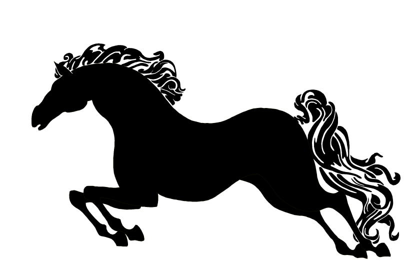 Illustration of a black horse that is running. The profile of the horse shows all four legs, the hair of his head and long tail.